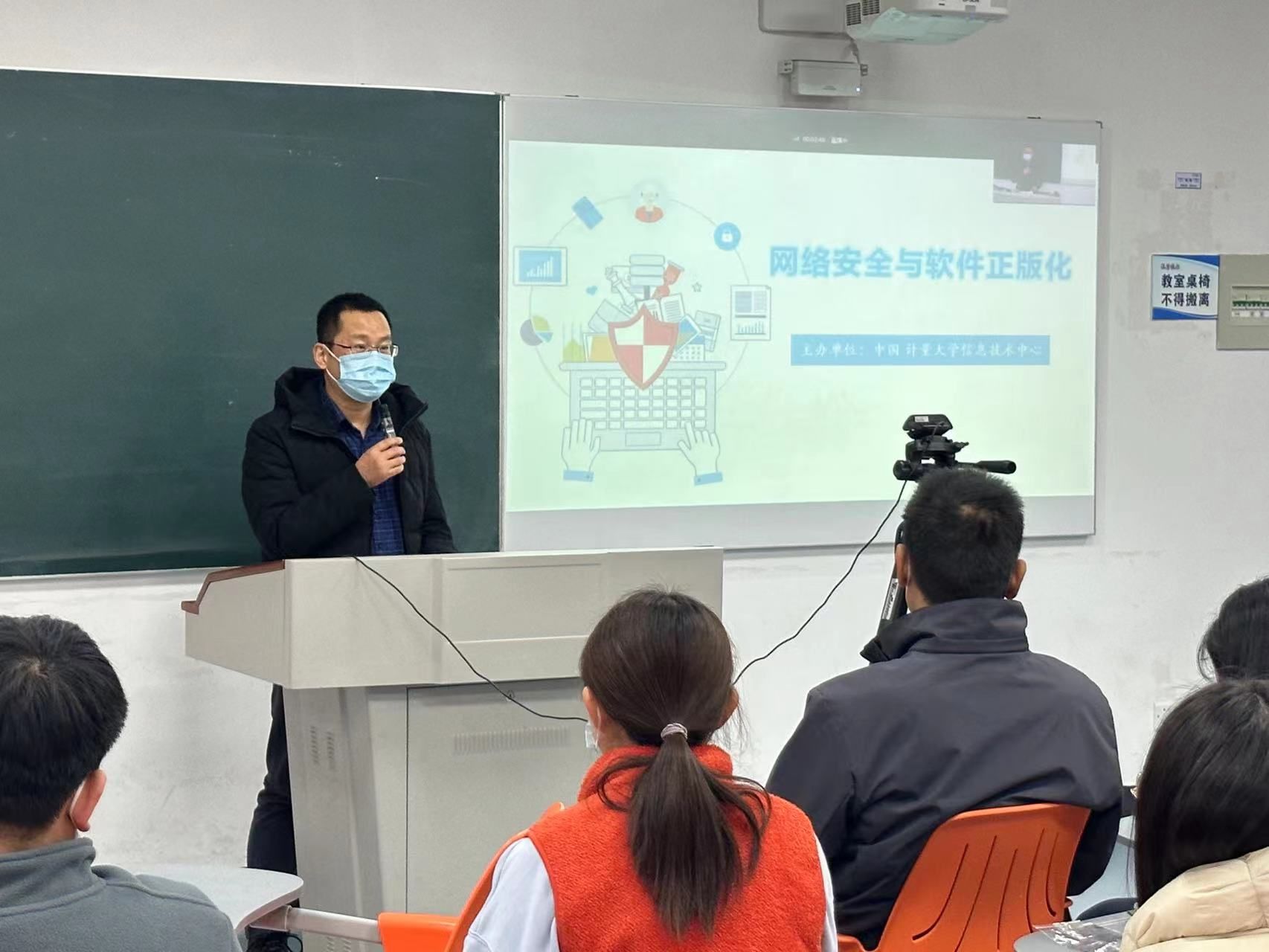 专题讲解之前,信息技术中心徐文龙主任致辞:“在数字网络节点上的每一个行为主体,都是保障信息安全的一道关口。多方主体都自觉成为信息安全卫士,不仅能维护自身数字权益,更能提高网络与信息安全的整体保障水平。”同时,徐主任宣告了学校已完成正版操作系统、办公软件使用权的招标,近期将部署供师生下载使用。