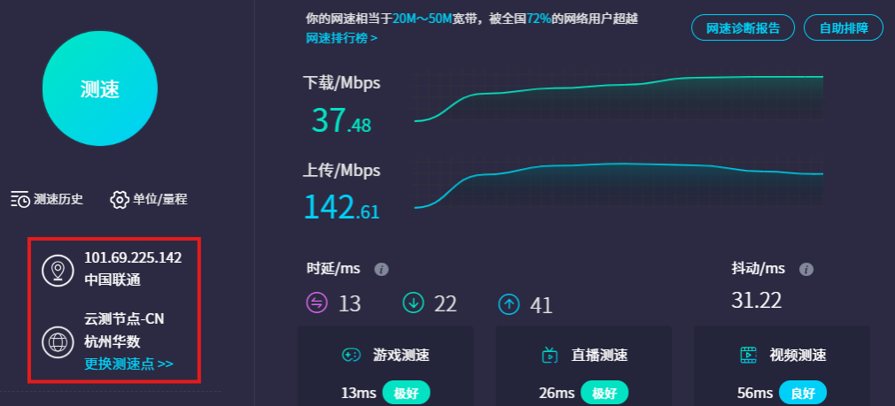2. 互联网测试:可通过访问外网测速网站(https://www.speedtest.cn),进行测试。
