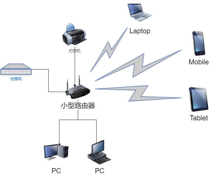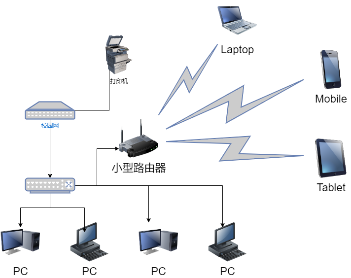 通过小型路由器,扩展有线无线用户:墙上端口接路由器wan口,有线(包括打印机等哑终端)无线用户分别通过路由器lan口和路由器广播的wifi信号接入网络。
