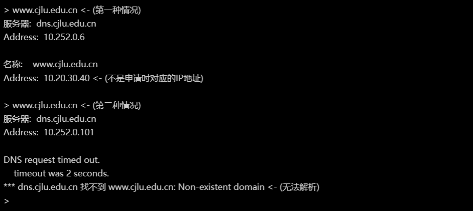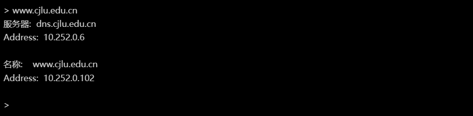 在提示符下键入要查询申请到的域名,如“www.cjlu.edu.cn”,回车。之后,返回如下信息,并返回IP地址是申请时对应的IP地址,则说明域名解析正常: